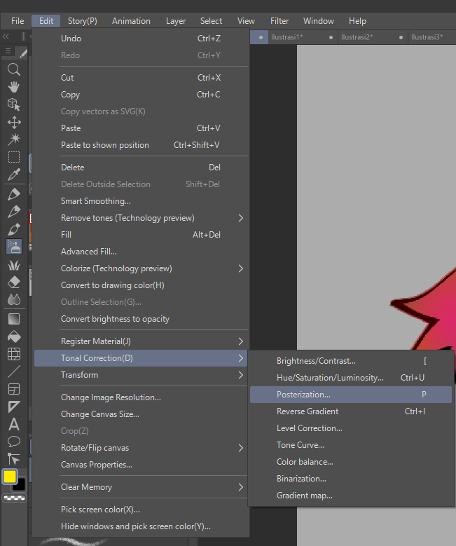 Then combine the new coloring and airbrush layers altogether to one layer. Now here's what you're going to do. Go to Edit -> Tonal Correction -> Posterize ...