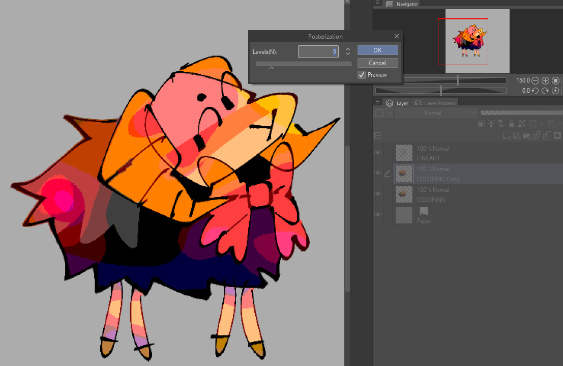 If this new posterized layer has too much of strong colors for you (that's what posterization does really), you can just lower the opacity until you find something you like. Personally I enjoy making posterized coloring layers of different levels and putting them all on different opacities to see what result I like the most.