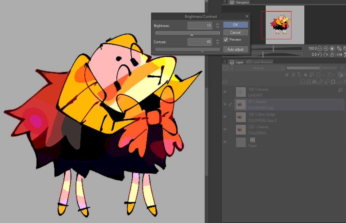 You can also adjust the contrast and saturation in the same Tonal Correction menu until you settle on something you like! This is a way more fun and brainless way of doing color variation, and one of the greatest advantages is that you can actually steer what kind of color variation you want on each part of the drawing.